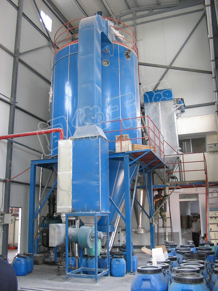 離心噴霧干燥工作原理:空氣經過濾和加熱,進入干燥器頂部空氣分配器,熱空氣呈螺旋狀均勻地進入干燥室。料液經塔體頂部的高速離心霧化器,(旋轉)噴霧成細微的霧狀液珠,與熱空氣并流接觸在短時間內可干燥為成品。成品連續地由干燥塔底部和旋風分離器中輸出,廢氣由風機排空。